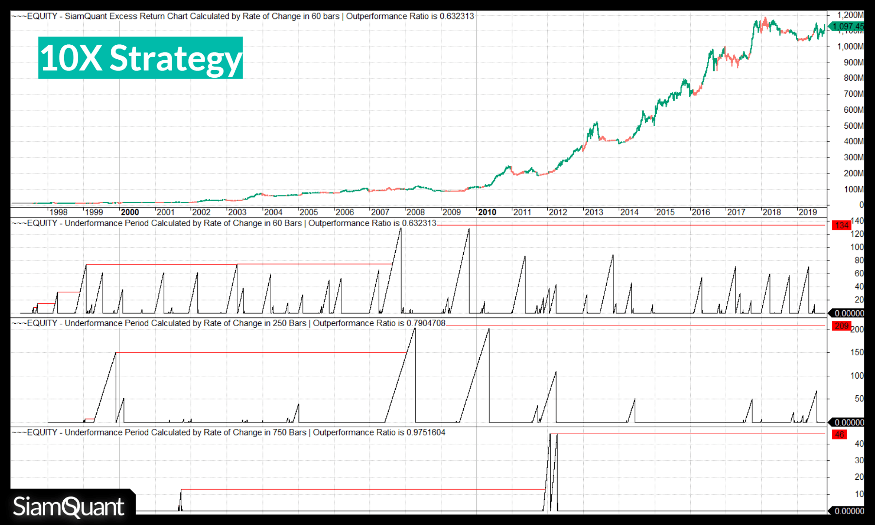 ภาพที่ 2 : กราฟ Excess Return Chart แสดงช่วงเวลาที่กลยุทธ์ 10X ให้ผลตอบแทนที่เหนือกว่าดัชนี SET Index (Outperformance สีเขียว) และย่ำแย่กว่าตลาด (Underperformance สีแดง) และกราฟ Underperformance Period (เส้นสีดำและแดง ในช่องที่ 2 ถึง 4 ตามลำดับจากด้านบน) ตามช่วงเวลาในการคำนวณที่ 1 ไตรมาส (ช่องที่ 2), 1 ปี (ช่องที่ 3) และ 3 ปี (ช่องที่ 4) ตั้งแต่ปี ค.ศ. 1997 ถึงวันที่ 18-10-2019