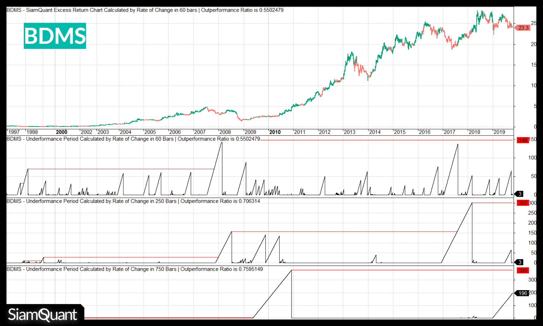 ภาพที่ 1 : กราฟ Excess Return Chart แสดงช่วงเวลาที่หุ้น BDMS ให้ผลตอบแทนที่เหนือกว่าดัชนี SET Index (Outperformance สีเขียว) และย่ำแย่กว่าตลาด (Underperformance สีแดง) และกราฟ Underperformance Period (เส้นสีดำและแดง ในช่องที่ 2 ถึง 4 ตามลำดับจากด้านบน) ตามช่วงเวลาในการคำนวณที่ 1 ไตรมาส (ช่องที่ 2), 1 ปี (ช่องที่ 3) และ 3 ปี (ช่องที่ 4) ตั้งแต่ปี ค.ศ. 1997 ถึงวันที่ 18-10-2019