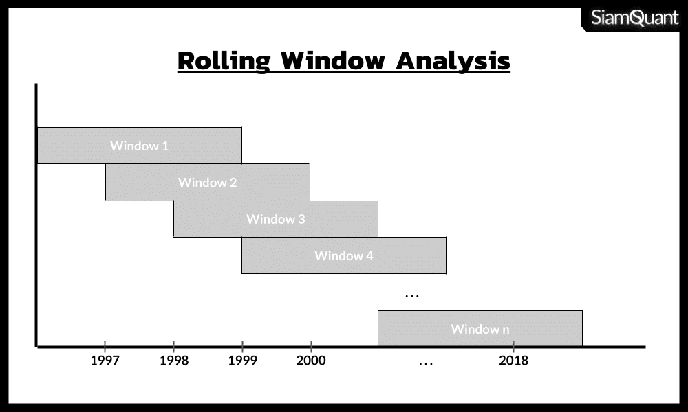 โดยในบทความนี้เราได้นำเทคนิค Rolling Window Analysis มาใช้ในการเก็บกลุ่มตัวอย่าง เนื่องจากการทำ Rolling Window Analysis คือ การขยับช่วงระยะเวลาในการทดสอบไปเรื่อยๆ โดยข้อดีของหลักการดังกล่าวคือ เราจะสามารถเก็บกลุ่มตัวอย่างมาทำการวิเคราะห์ทางสถิติได้มากขึ้น ภายใต้ข้อมูลที่มีอยู่อย่างจำกัดนั่นเอง!!